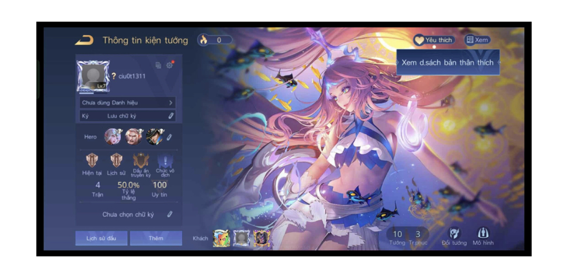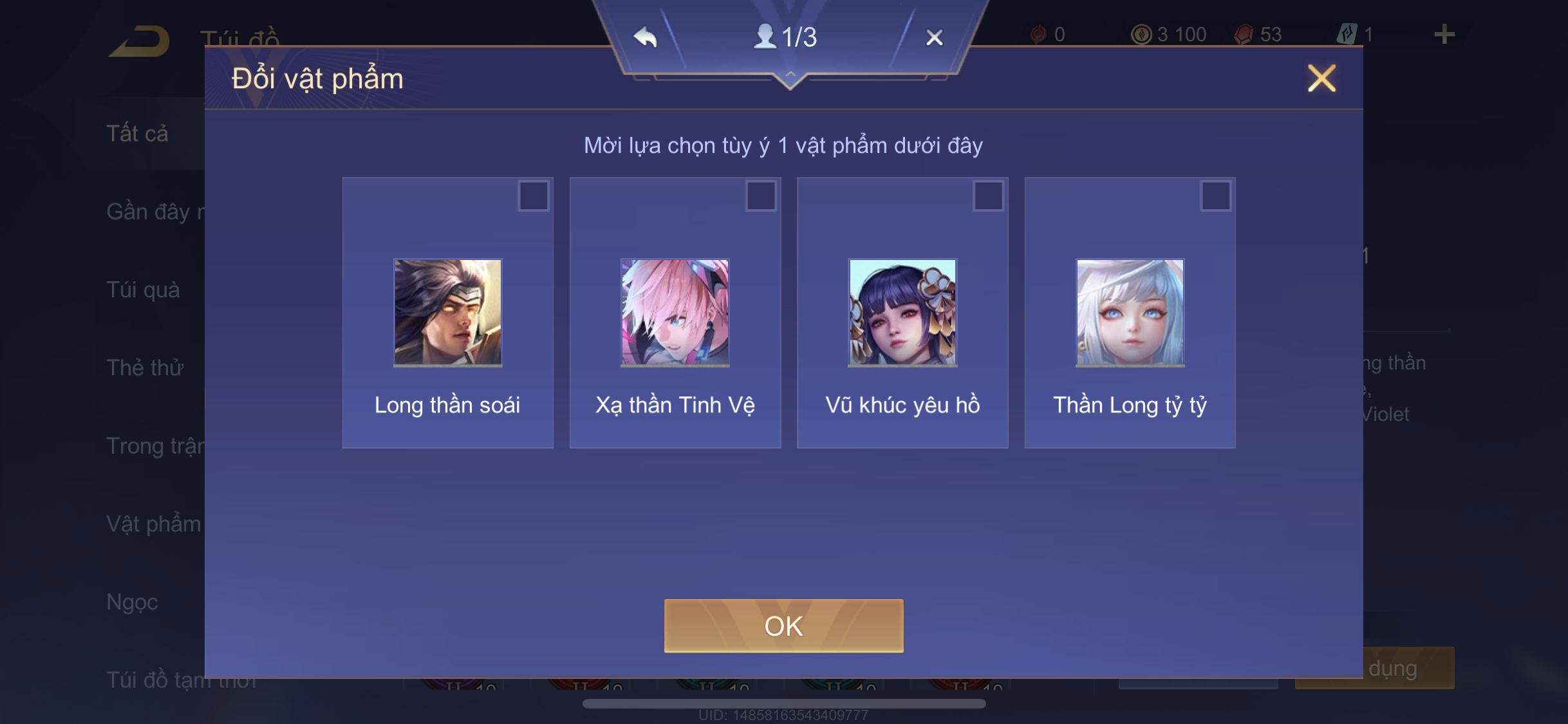 Acc có sẵn rương ss chọn 1 trong các skin yorn(long thần soái), tel’anas(vũ khúc yêu hồ), violet( thần long tỷ tỷ), laville(xạ thần tinh vệ)lưu ý:acc lv 3